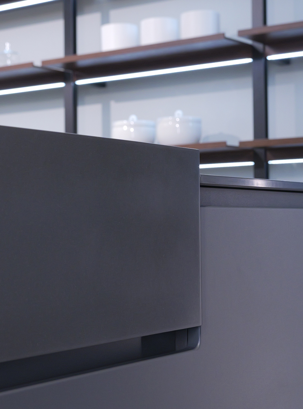 Η σύνθεση αναπτύσσεται γύρω από κεντρική νησίδα, ανοιχτό σύστημα επιτοίχιων ραφιών και στήλες, ισορροπώντας κλειστούς αποθηκευτικούς χώρους με ανοιχτά στοιχεία. Ο σχεδιασμός χωρίς πόμολα και οι ενσωματωμένοι μηχανισμοί υποστηρίζουν σαφή χρήση και οπτική ελαφρότητα. Τα υλικά και οι επιφάνειες επιλέγονται για σταθερότητα, αντοχή και καθημερινή λειτουργικότητα.