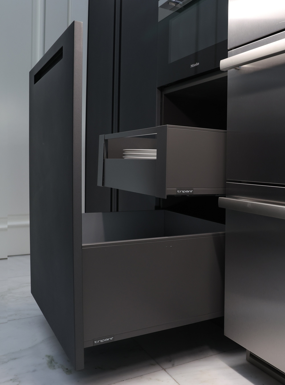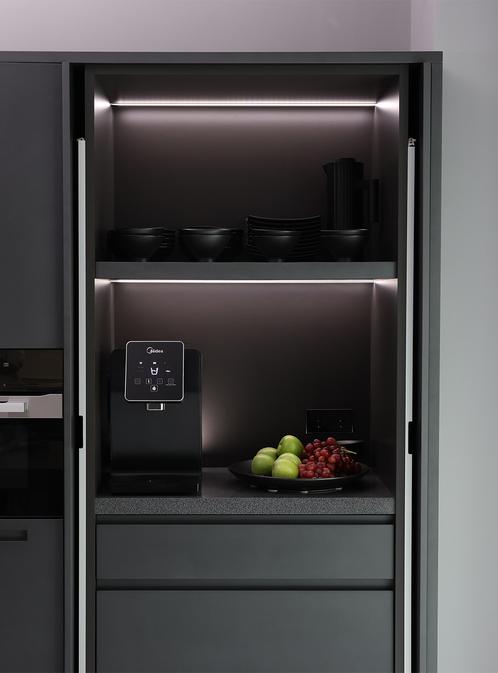 Η σύνθεση αναπτύσσεται με γραμμικό πάγκο και στήλες, διατηρώντας σαφή οργάνωση και οπτική ισορροπία στον χώρο. Ο μηχανισμός pocket door με χωνευτές πόρτες επιτρέπει την πλήρη απόκρυψη των λειτουργικών ζωνών, διατηρώντας την καθαρότητα των επιφανειών όταν η κουζίνα δεν χρησιμοποιείται. Οι ματ σκούρες όψεις σε συνδυασμό με το ανοιχτόχρωμες επενδύσεις τοίχου και το φυσικό φως ενισχύουν την αίσθηση βάθους και ηρεμίας. Το κεντρικό τραπέζι, με βαφή σαγρέ λάκα αυτοκινήτου, λειτουργεί ως σημείο καθημερινής χρήσης και συνάντησης, συνδέοντας τη λειτουργία της κουζίνας με τον χώρο τραπεζαρίας. Οι αθόρυβοι μηχανισμοί και οι ενσωματωμένες λεπτομέρειες ολοκληρώνουν μια λύση σχεδιασμένη για ακρίβεια, λειτουργικότητα και διαχρονική αισθητική.